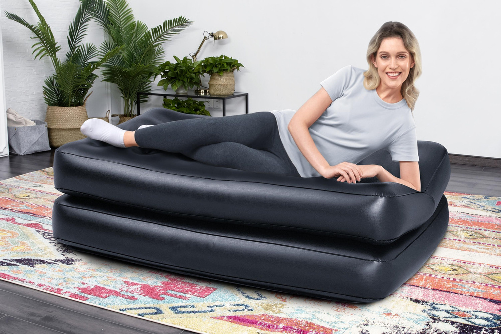 Już teraz możesz w parę sekund zamienić wysoką sofę na dwuosobowe łóżko, łóżko z oparciem lub po prostu bardzo wygodny materac. Decyzja należy tylko do Ciebie. Sofa wykonana została z mocnego PVC. Wygodne podłokietniki sprawiają, że oglądanie ulubionego serialu bądź czytanie ulubionej książki staje się czysta przyjemnością. Materac przeznaczony jest do użytku dwuosobowego. Dołączona do zestawu elektryczna pompka przyśpieszy proces montażu kanapy. Dzięki specjalnej budowie kanapę można szybko i bez wysiłku przekształcić a dzięki solidnej konstrukcji z winylu, sofa jest odporna na uszkodzenia i wygodna. Łóżko jest odpowiednie do użytku w pomieszczeniach. W zestawie znajduje się specjalny futerał, który ułatwia transport i zapewnia bezpieczne przechowywanie.
