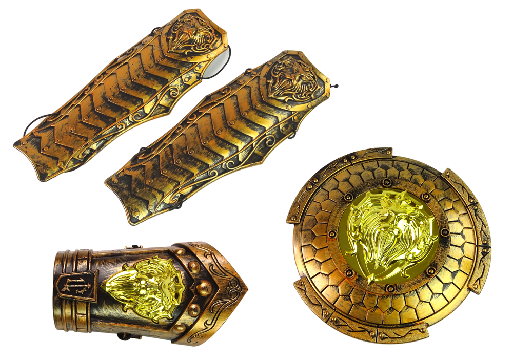 Większość osób marzy o rycerskich przygodach, które nieraz słyszeli w bajkach. Przemierzać góry i doliny, aby ratować ludność przed potworami i piękne księżniczki z opresji. Piękna, złota zbroja z dodatkami przeniesie malucha w bajkowy świat. Ochraniacze na nogi, tarcza, zbroja wykonane są z twardego plastiku, będą stanowić potężną skorupę w trakcie walk.