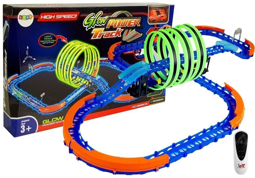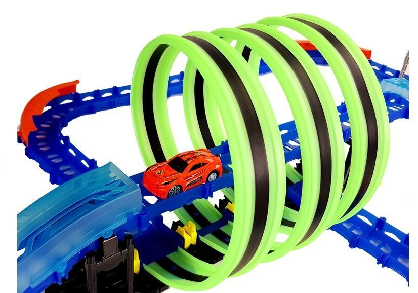 Wyścigowy tor składa się z dużej ilości elementów, dzięki którym zabawa może rozpocząć się już podczas składania go. Ilość pętli pozwoli na jazdę 360 stoni. Jest to bardzo proste, ale pasjonujące zadanie. Obudzi w dziecku spryt i ambicje. Neonowe elementy świecą w ciemności, dzięki temu zabawa wieczorami będzie jeszcze lepsza!