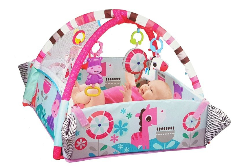 Kolorowe grafiki wzbudzają ciekawość dziecka oraz pomagają rozwijać wzrok. Do produktu dołączone są kulki, które możemy wsypać do basenu i zapewnić niezapomnianą zabawę. Matę można używać już od narodzin dziecka. Żywe kolory i wzory przyciągną uwagę najbardziej niespokojnego niemowlaka. Do zestawu załączony jest jeszcze hipopotam na baterie, wystarczy że Twój maluch pociągnie za rączkę i usłyszy muzyczkę. Na górze pomiędzy pałąkami jest także siatka z otworami do rzucania piłeczkami.
