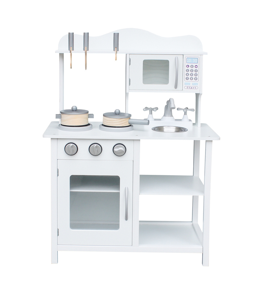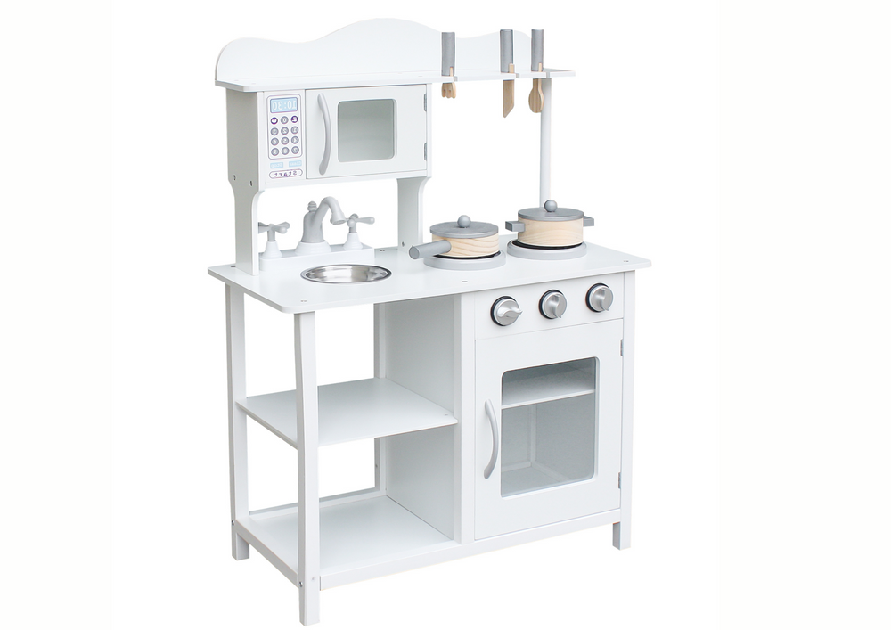 Kuchnia posiada wiele pokręteł i drzwiczek co sprawi, że kilkulatek rozwinie swe umiejętności motoryczne i odruch chwytania przedmiotów o różnym kształcie. Cała kuchnia ma kolor biały z szarymi pokrętłami i uchwytami. Blat ma kolor biały znajduje się na nim zlewozmywak i palniki, na który można gotować cudne potrawy. Nad zlewozmywakiem zamontowana jest mikrofalówka z otwieranymi drzwiczkami i dwoma pokrętłami. Półeczki pod spodem i szafeczka z otwieranymi drzwiczkami pozwolą na utrzymanie porządku oraz przechowywanie garnków i produktów spożywczych. Do całości zestawu dołączone są super elementy, dzięki którym można przygotować śniadanie. Idealnie wpasuje się do każdego wnętrza, a zwłaszcza do pokoju dziecięcego.