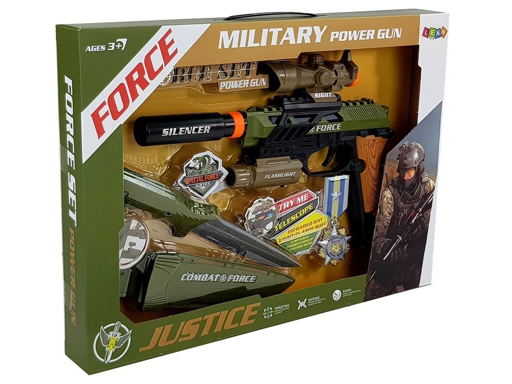 Wszystkie elementy wykonane są z wysokogatunkowego tworzywa, co jest gwarancją, że będą służyć dziecku przez długi czas. Całość utrzymana jest w kolorystyce ciemnej zieleni. Pistolet po naciśnięciu na spust wydaje odgłos strzału, przeładowania oraz odgłos upadającej łuski. Po założeniu tłumika dźwięk jest całkiem inny. W czasie tych czynności można zauważyć dodatkowo efekty świetlne na broni. Żaden przeciwnik nie ucieknie! Wyobraźnia malucha na pewno się rozwinie. Natomiast, aby zwiększyć celność i precyzję w pistolecie zamontowany jest celownik, który sprecyzuje strzał. Latarka oświetli dodatkowo pomieszczenie. Długi gumowy nóż będzie także niezbędnikiem podczas bitwy.