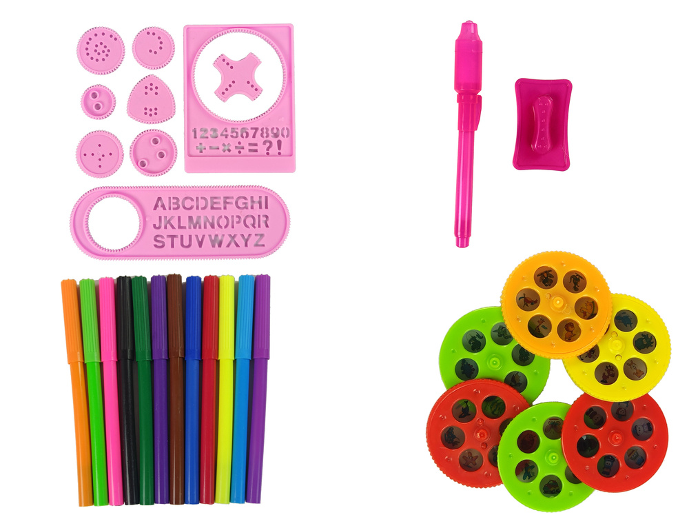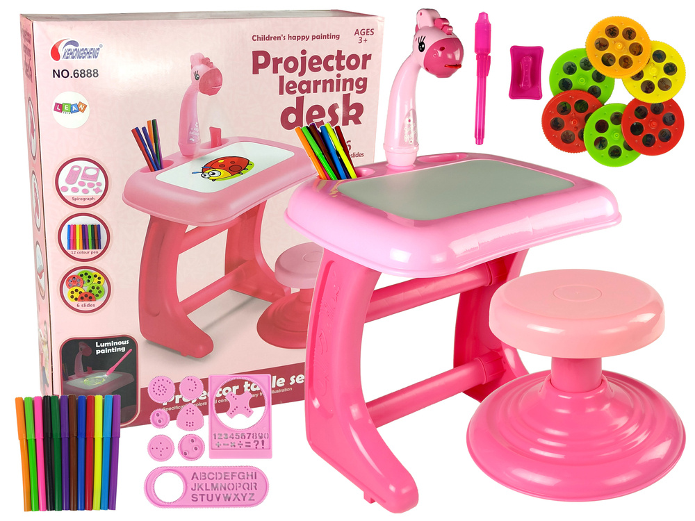 W skład zestawu wchodzi także mały taborecik, za pomocą którego Twoje dziecko będzie w stanie wygodnie siedzieć przy stoliku. Zarówno siedzisko, jak i stolik są utrzymane w różowych barwach, będzie idealnym uzupełnieniem wystroju pokoju dziecięcego. Na blacie stolika znajdują się dwie małe szufladki, w których można chować pisaki w pełnej gamie kolorów, są zawsze w zasięgu ręki. Projektor umieszczony na środku stolika przypomina wyglądem przyjazną żyrafę. Wyświetla najróżniejsze obrazki ze zwierzątkami oraz postaciami, które można przerysować na kartkę. Szablony w zestawie nauczą Twoje dziecko odpowiednich nazw figur geometrycznych oraz pisania literek.