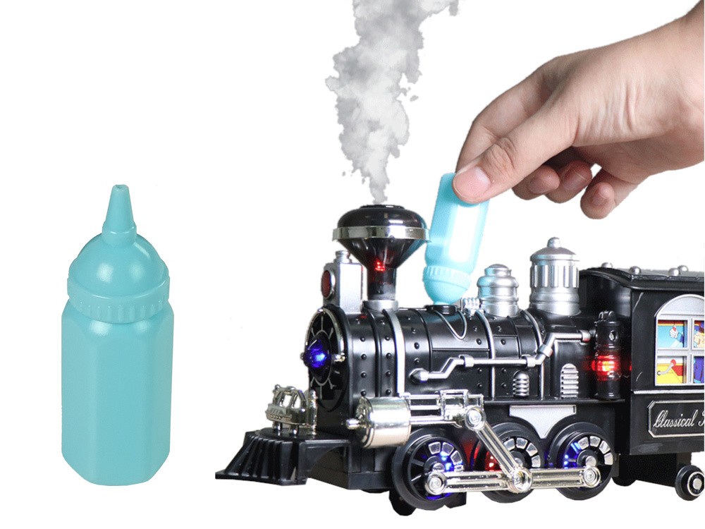 Dodatkowo zaletą produktu jest dołączony do zestawu kroplomierz, wystarczy wlać kilka kropel do otworu w lokomotywie. Podczas poruszania się po torze, można zobaczyć, jak bucha para wodna z komina.